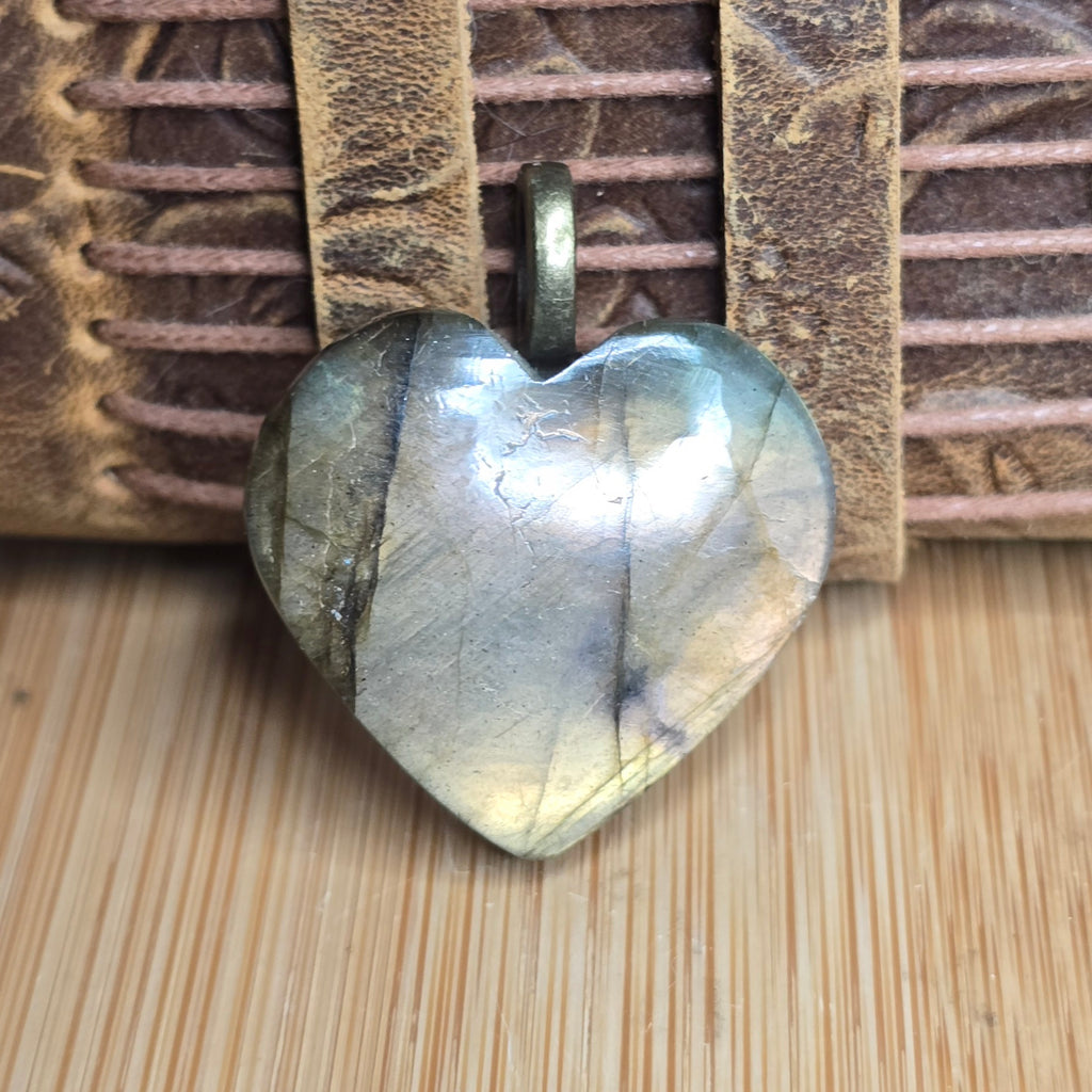 This labradorite heart lights up when it wants to, flashing gold and green beneath a calm gray surface. The glow moves as you move, like fire caught under stone. It’s one of those pieces that feels alive without needing attention.