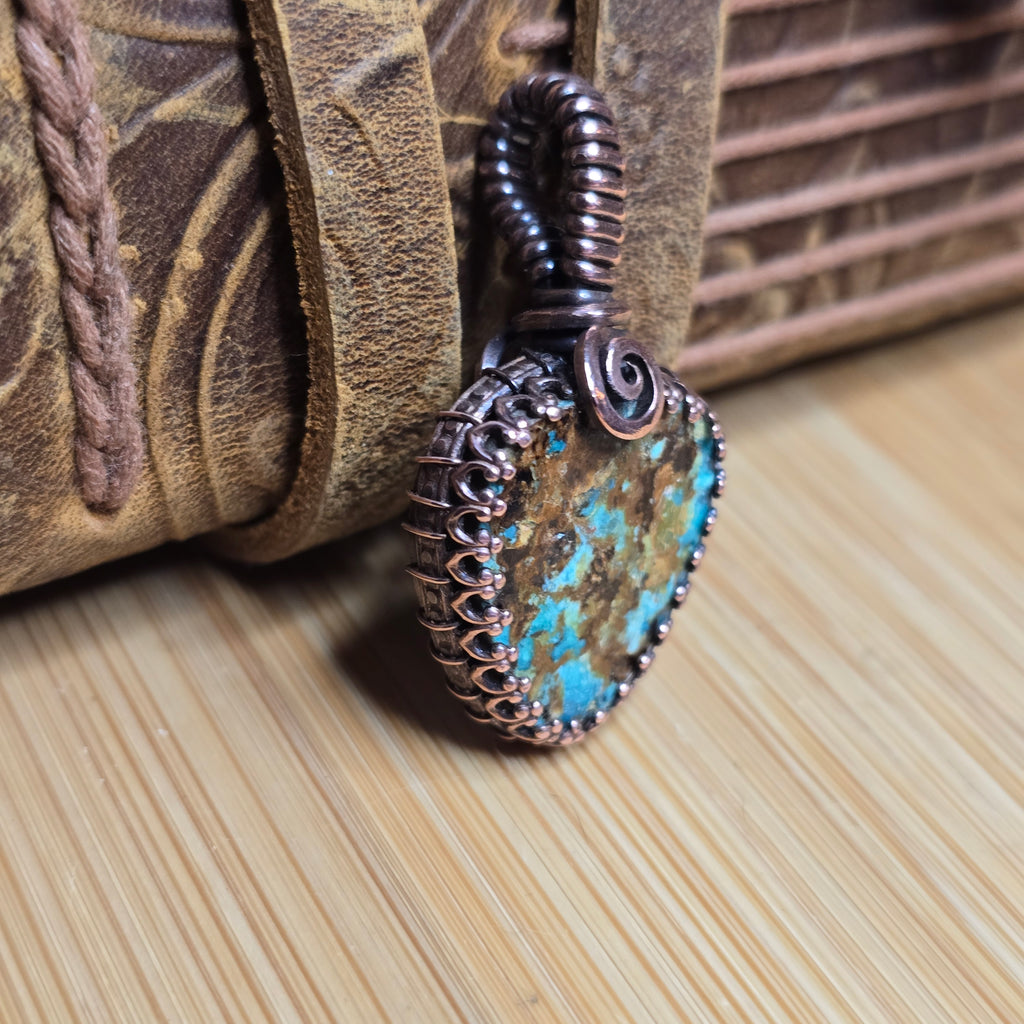 Wrapped in antiqued copper with tight gallery detailing, this pendant has a sturdy, rustic presence that matches the grit of its origin. The bold bail and spiral accent give it the look of something found in an old prospector’s kit. Only one available.