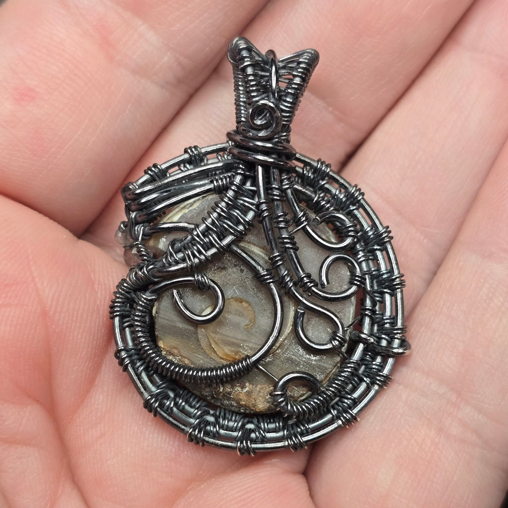Spiraled deep in the belly of the Deccan Plateau, this ancient sea creature left behind more than bone. Over millions of years, its coiled body filled with chalcedony and quartz—layering memory in minerals, wave by wave. The result is this gemshell: a fossilized spiral of crystal and sediment, like evolution’s own fingerprint caught in stone.