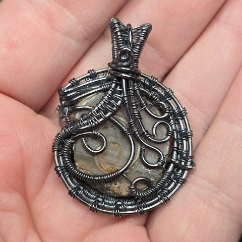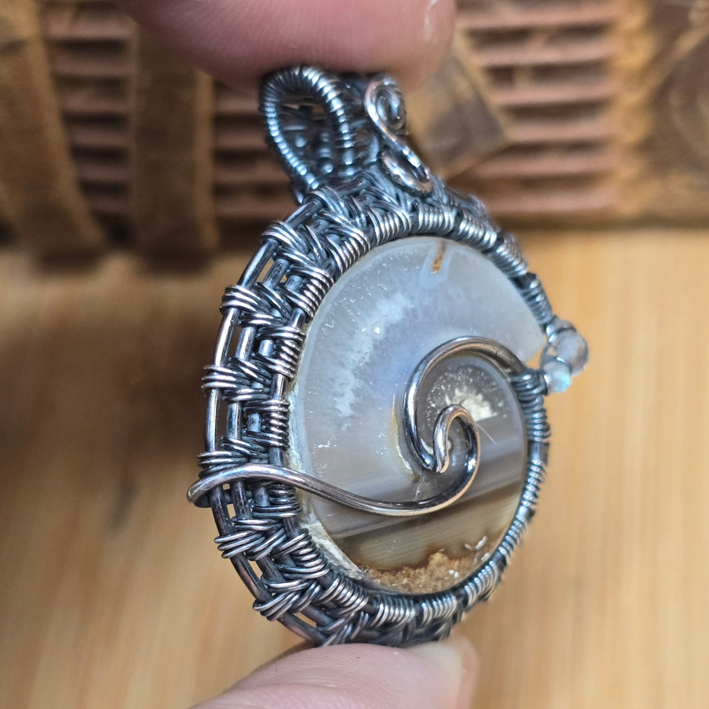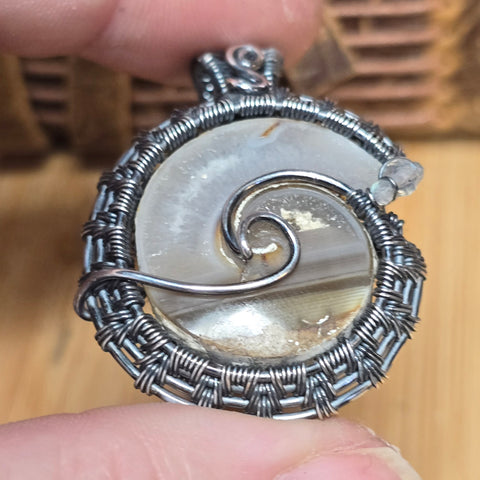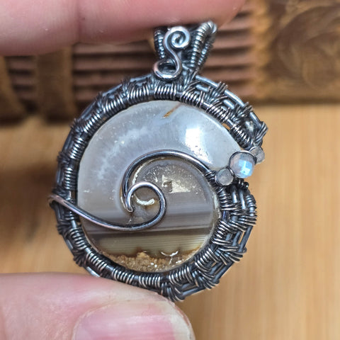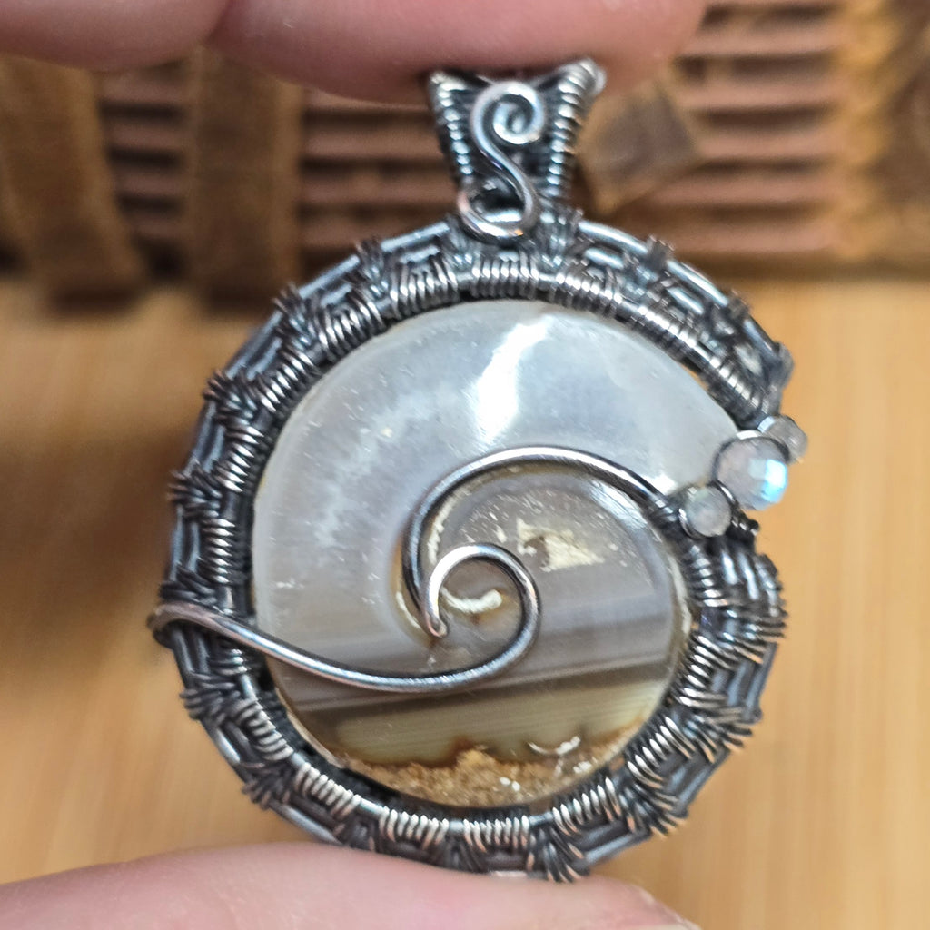 Hand-wrapped in antiqued sterling silver, its curve is echoed by wire and softened by twin moonstones—quiet reminders that some cycles are worth honoring. This one’s for the folks who feel time in their bones and carry the weight of oceans in their chest. Only one. Of course.