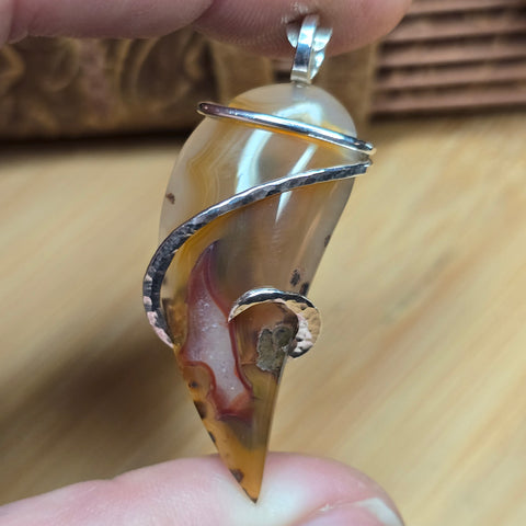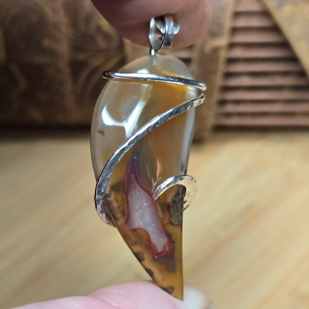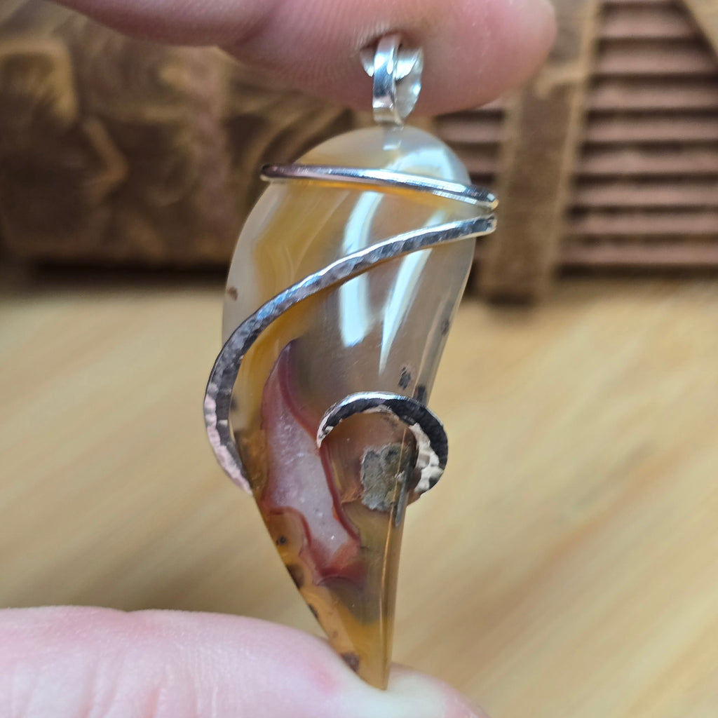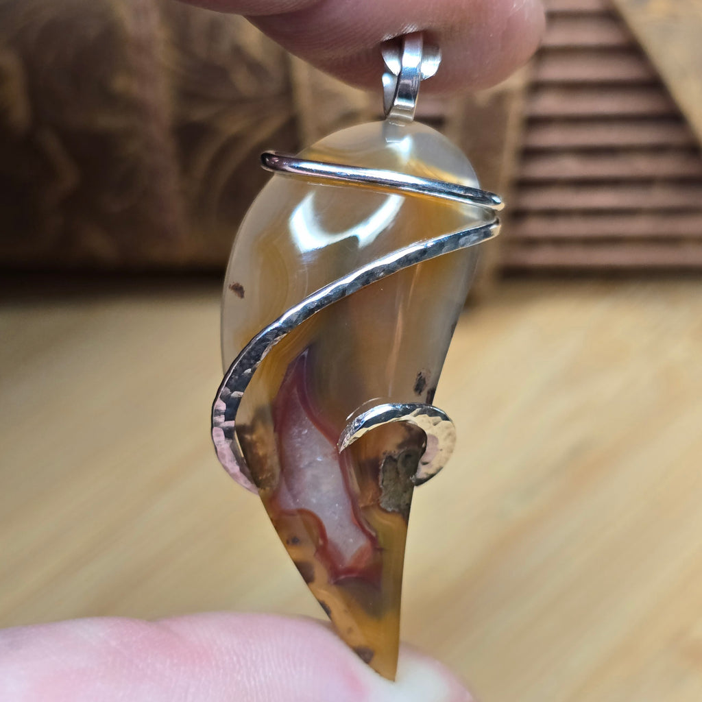 Cut from natural Agua Nueva agate from Chihuahua, Mexico, this piece shows off the characteristic flame-like patterns that collectors love. The hammered sterling silver wrap arcs around it like desert wind around sandstone spires — hand-shaped, intentional, and grounding.