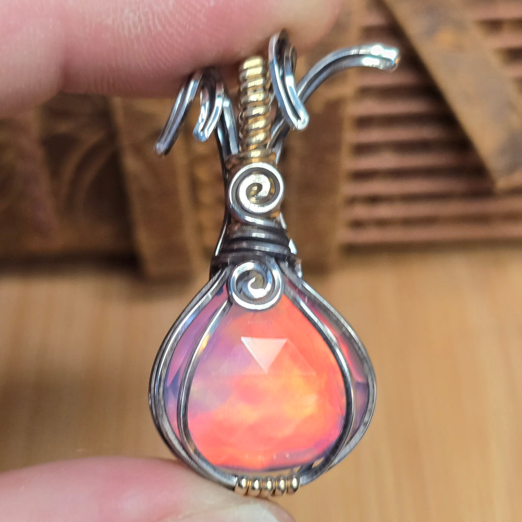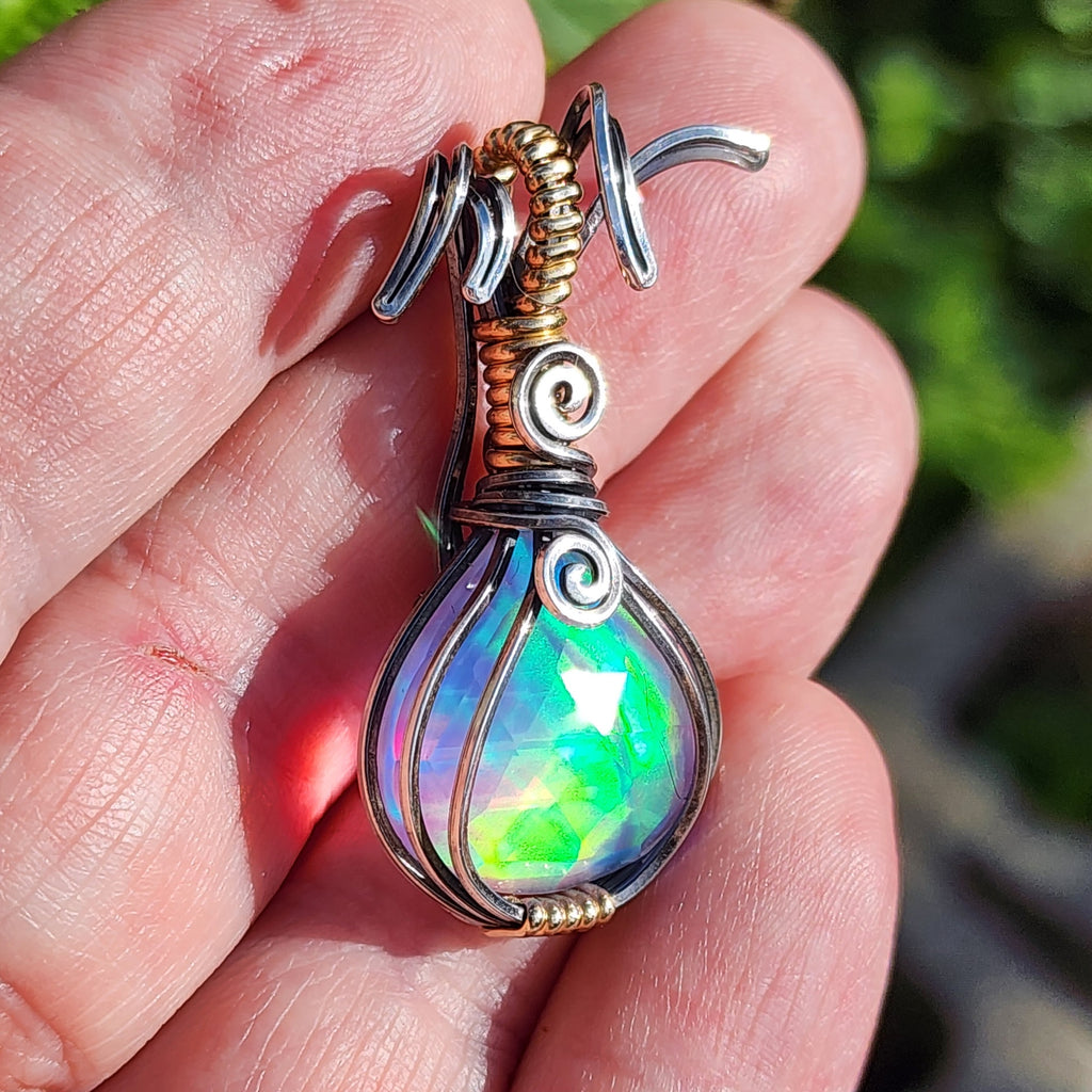 After a full harvest of pumpkins, it was only fair to wrap an onion. This playful pendant glows with layers of color — a faceted Aurora Opal that shifts from lavender to ember orange like a sunset caught in glass. Wrapped in sterling silver and 14kt yellow gold fill, it’s shaped like a tiny, radiant onion bulb: humble, earthy, and quietly magical.