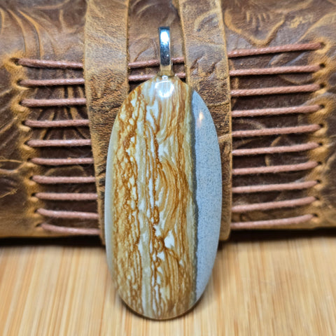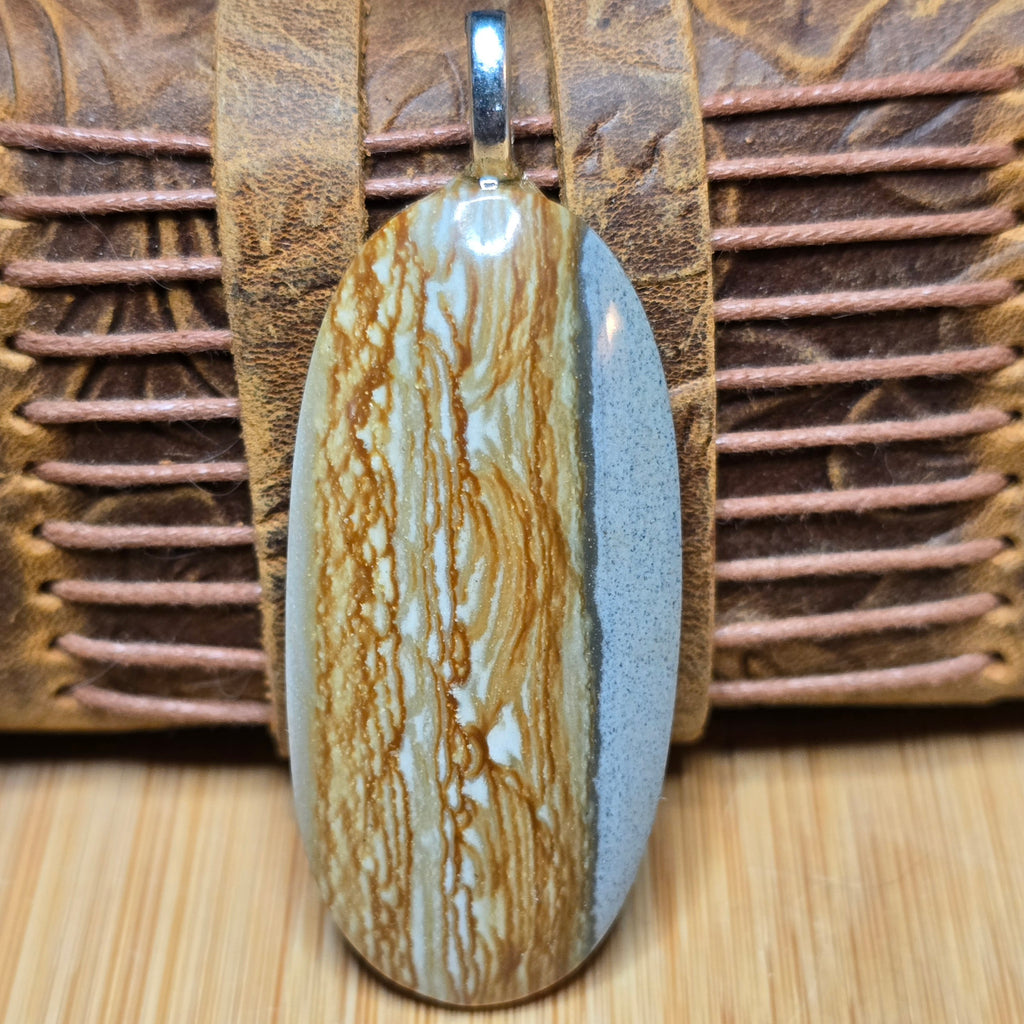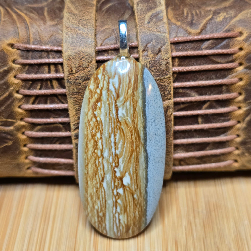 This stone reads like water running through clay. Warm caramel and cream channels move vertically through a cool gray field, giving it that unmistakable Chicken Track look. It feels grounded, steady, and quietly wild.