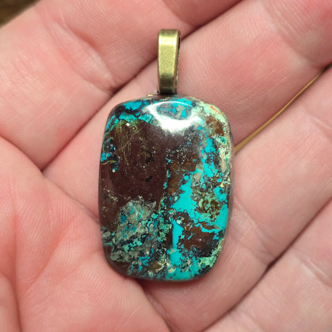 This pendant contains a natural copper mineral suite where chrysocolla, malachite, and cuprite formed together through oxidation of copper-bearing rock. The cab was cut to keep the color contrast intact rather than chase symmetry, then polished to reveal internal structure without erasing texture. Only one available.