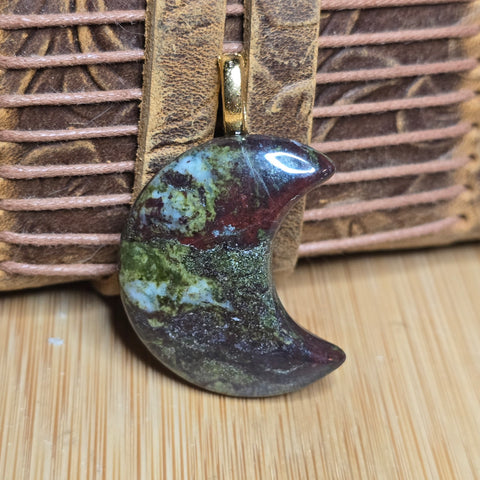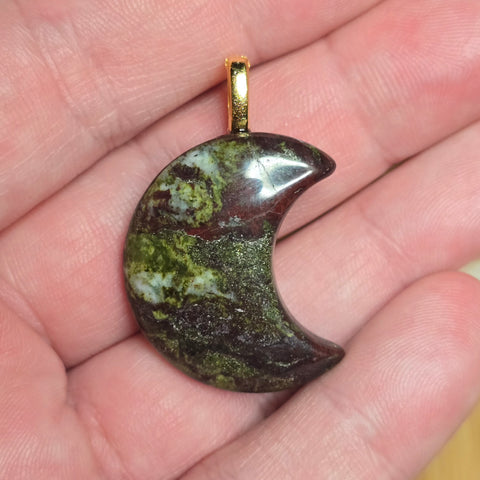 Dragon Bloodstone forms through hydrothermal alteration where serpentinite hosts iron-rich jasper and epidote. This piece was shaped and polished to preserve the natural color boundaries and texture shifts rather than smoothing them away. Only one available, and this exact moon cannot be repeated.