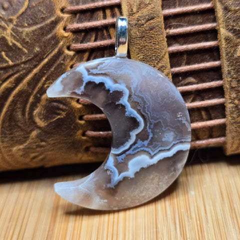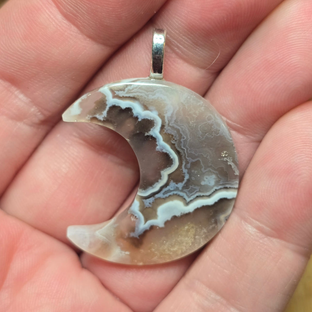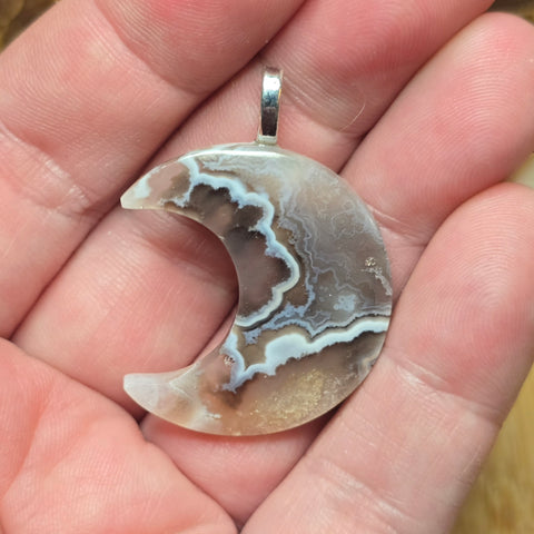 This crescent moon holds slow-moving lace and plume patterns that feel tidal, like fog lifting off warm stone. Soft translucent browns and grays are edged with pale blue chalcedony banding that traces the curve of the moon and gives it depth without drama. Light passes through the thinner edges, revealing layers instead of shine.