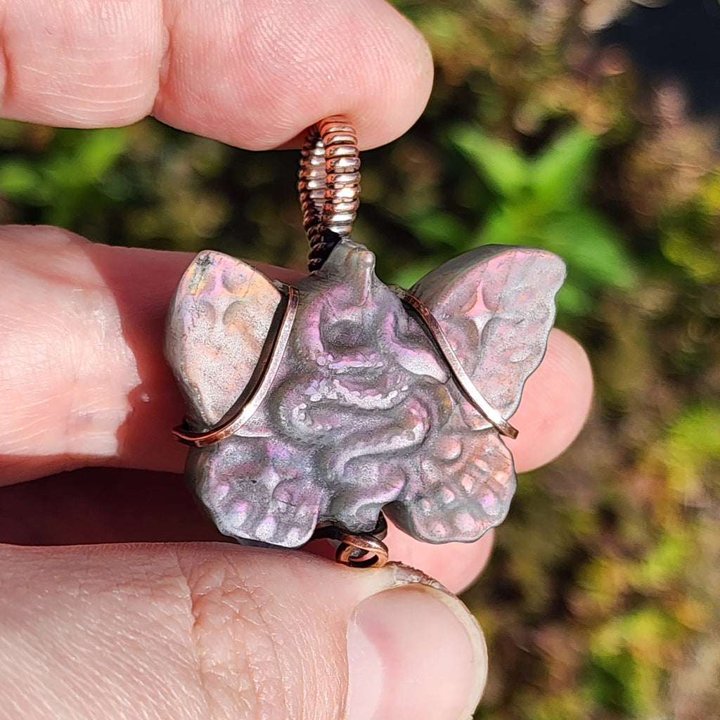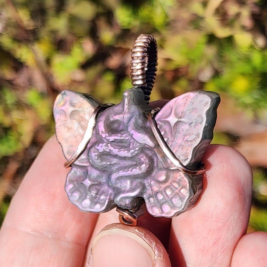Carved with hypnotic detail, this matte labradorite pendant reveals a coiled serpent nestled between winged forms — like transformation frozen in myth. Its shimmer is subtle, shifting with the light: dusky lilac, rose ash, soft green shadow. A quiet talisman for those who walk between worlds.
