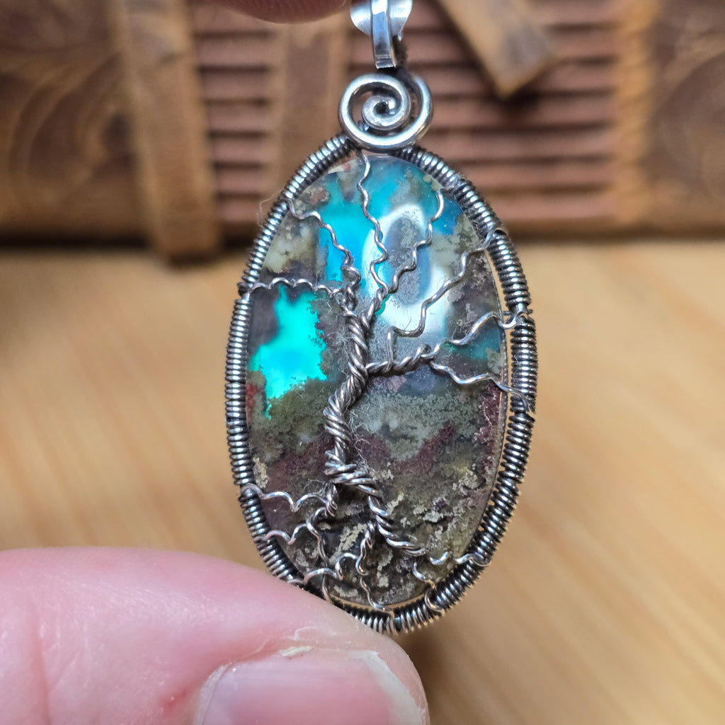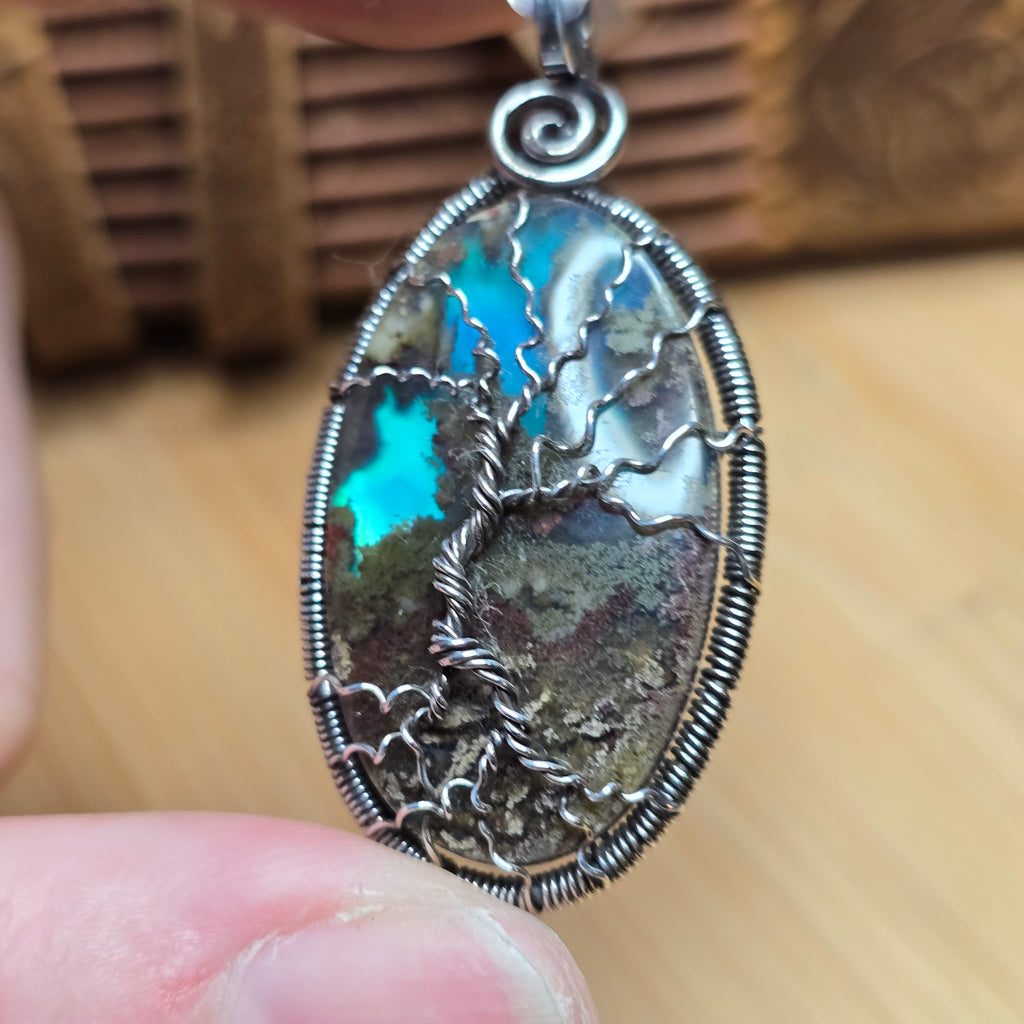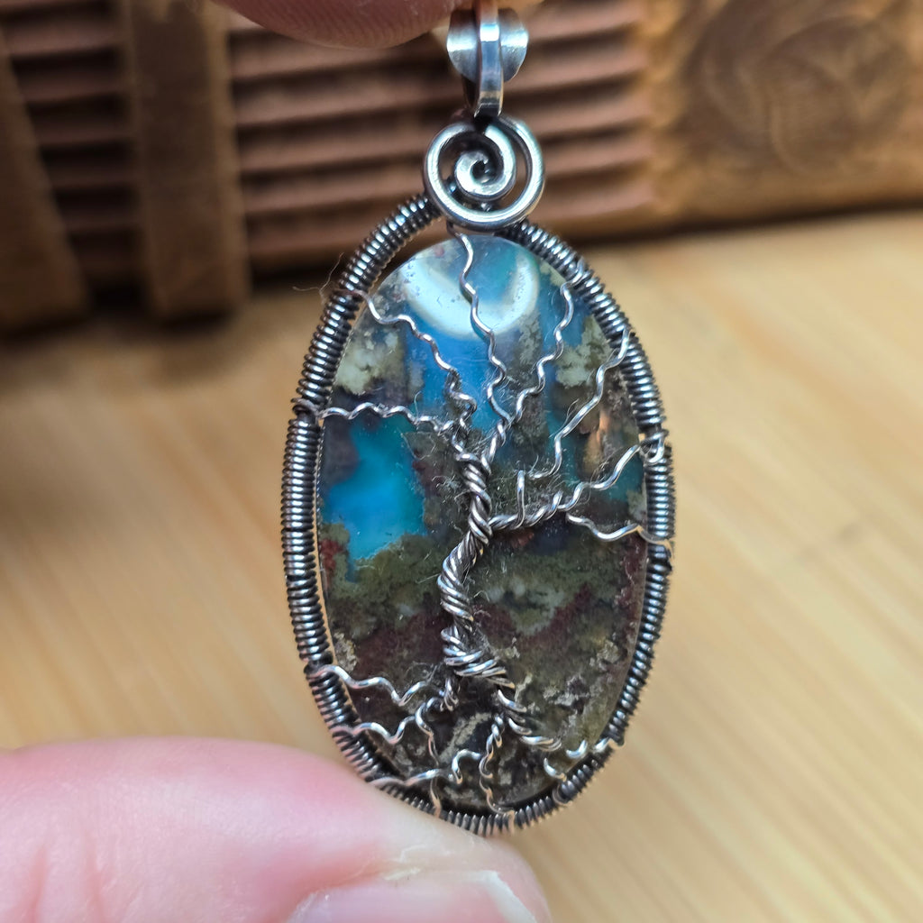 🔹 Setting: Sterling silver, hand-wrapped Tree of Life design