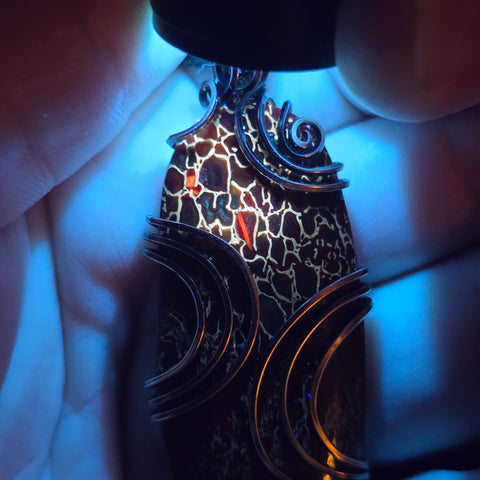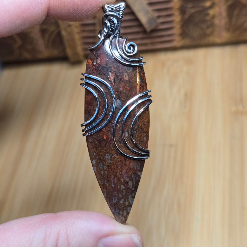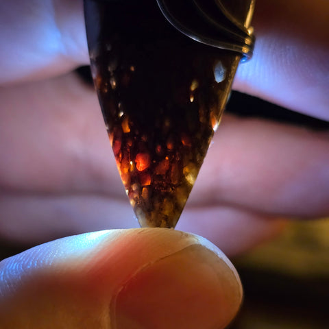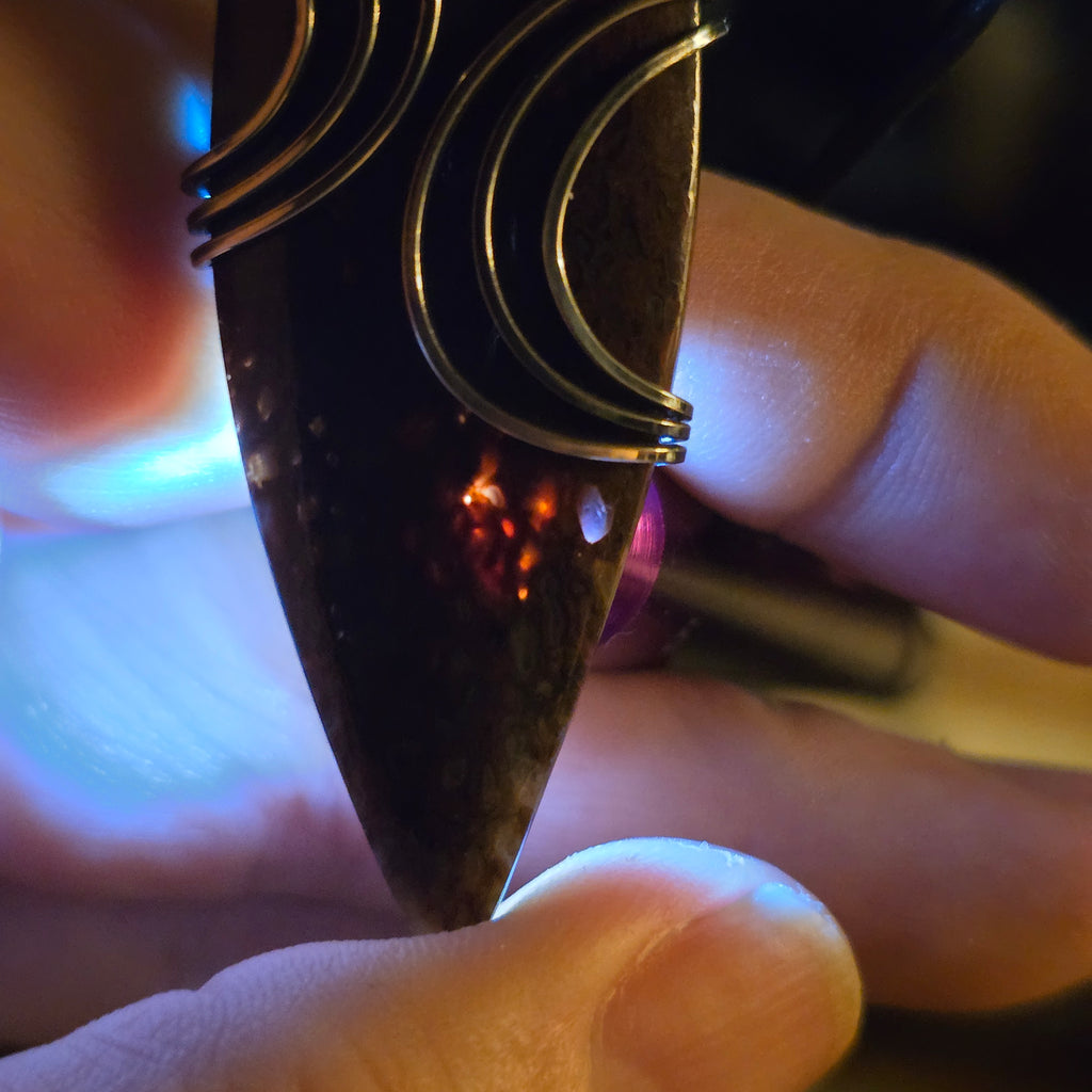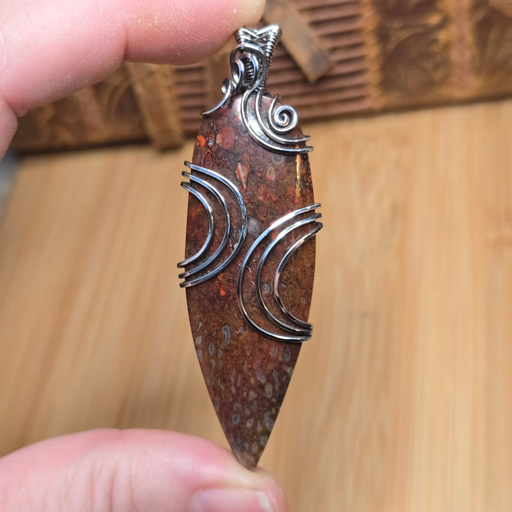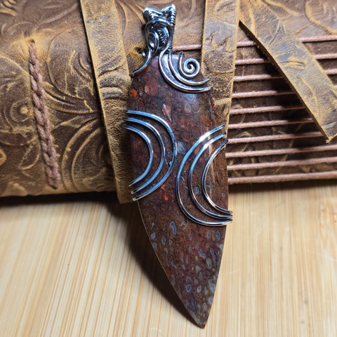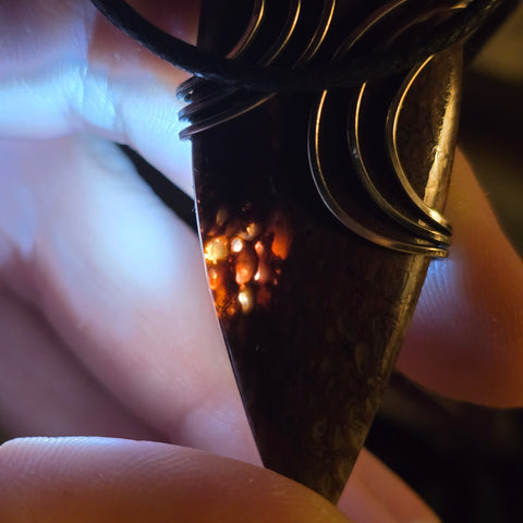 This pendant holds a fragment of ancient earth — agatized dinosaur bone from Utah, where time and silica transformed marrow into stone. Each cell once carried life; now it catches light, glowing from within like embers beneath the desert crust.