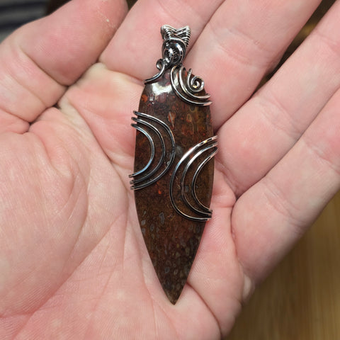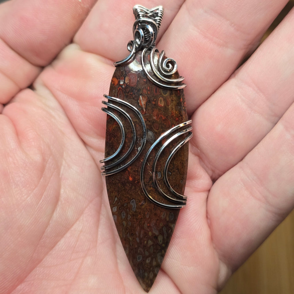 The fossil’s natural cell walls glow deep orange and gold under light, proof of full silicification. Set in bright sterling silver, the wirework curves around the fossil’s pattern like a memory of motion — clean, modern lines framing deep prehistory.