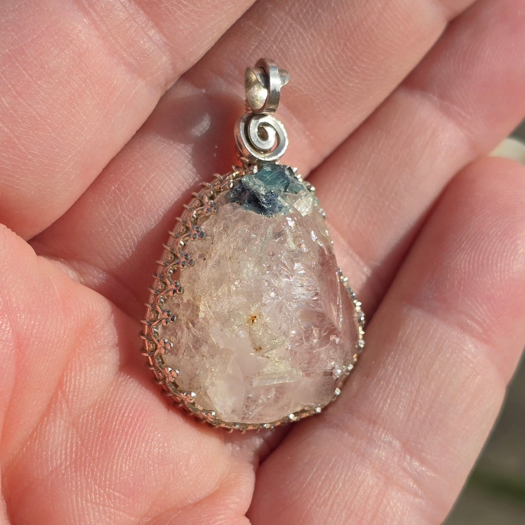 The quartz gleams with luminous purity, while the embedded Indicolite Tourmaline brings ocean-deep calm and insight—a striking combo that radiates clarity, focus, and high-vibe energy. Whether you wear it for style or for spirit, this pendant is here to support your shine.