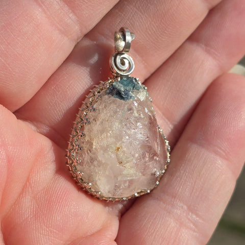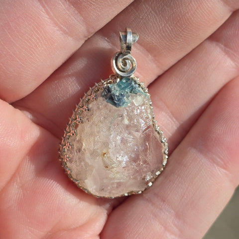 This one-of-a-kind Quartz and Indicolite Tourmaline Pendant is a fusion of clarity and depth, featuring a natural quartz crystal crowned with a rare chunk of deep blue Indicolite Tourmaline. Wrapped in sterling silver using our exclusive hybrid design, this piece is equal parts elemental and elegant—a talisman for those who crave truth, intuition, and grounded beauty.