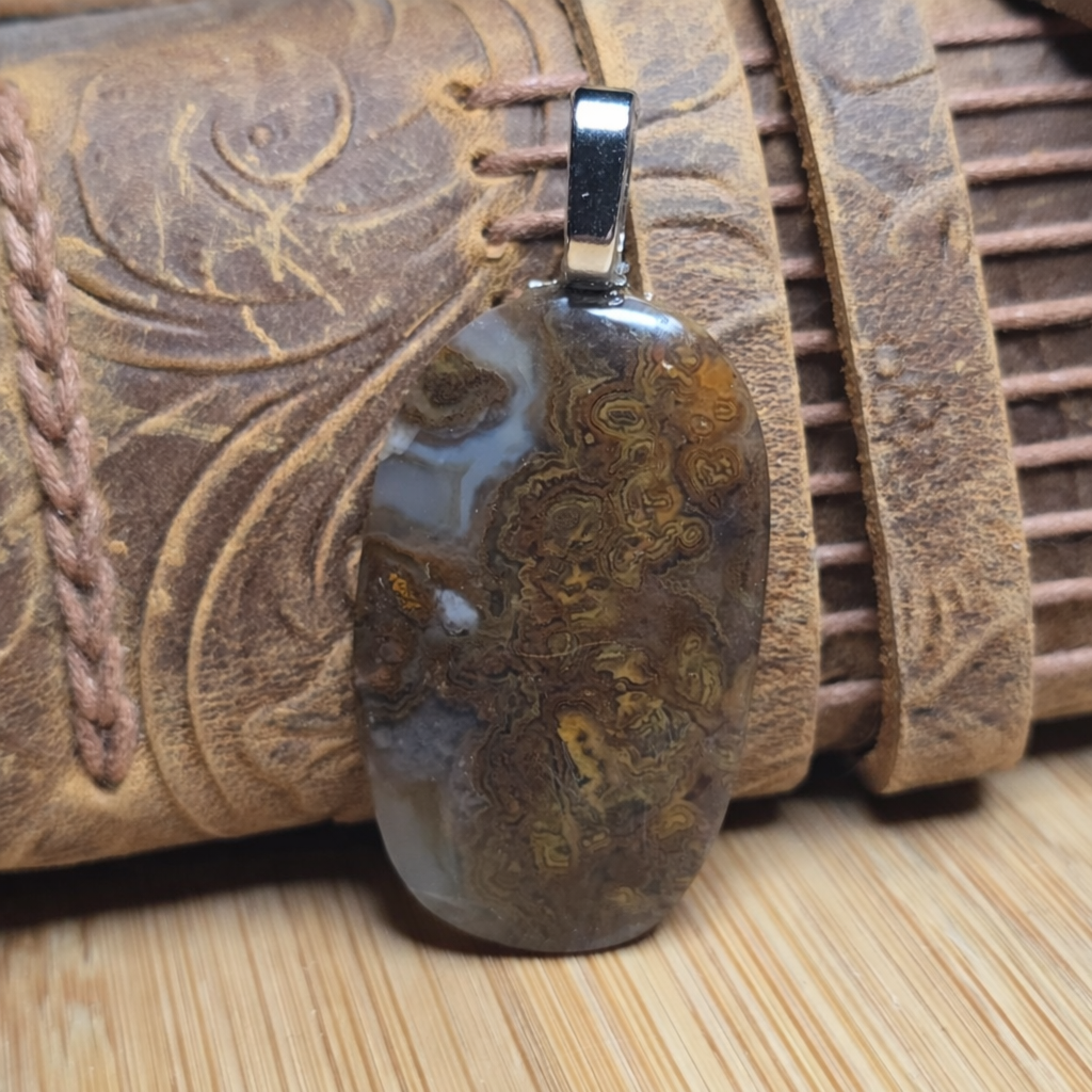 Likely Oregon moss agate, this piece shows classic microbialite-driven patterning rather than banding, formed as silica moved through iron- and organic-rich zones over time. Polished to a smooth face and finished with a simple silver tone bail so nothing competes with the stone itself. Only one available.