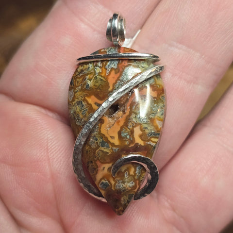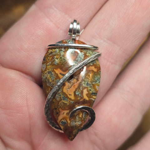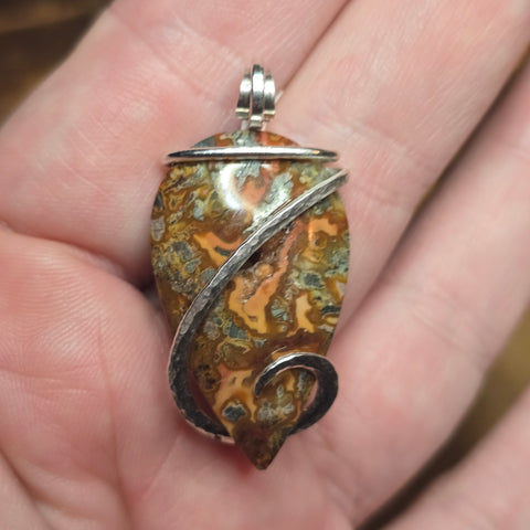 The sterling silver wrap curves like smoke over stone, hammered by hand to echo the stone’s molten flow. It’s both elegant and elemental — a small universe of fire, mineral, and time you can hold in your hand.