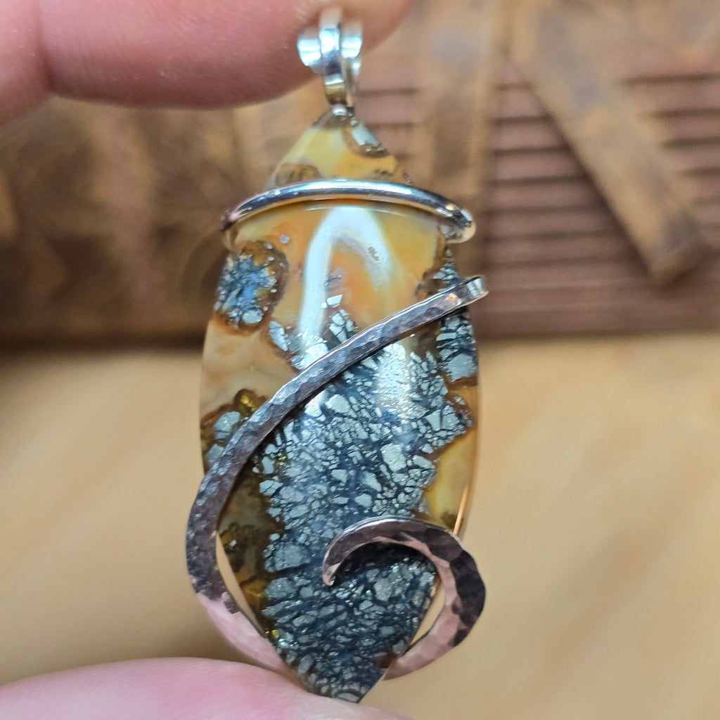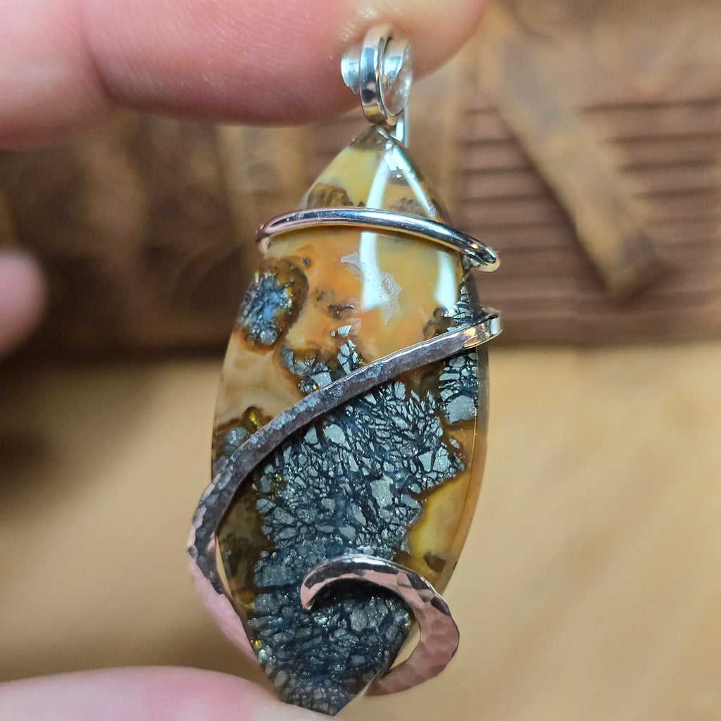 Set in sterling silver with hand-forged curves, the design flows like wind through canyon sandstone, catching the light on every hammered edge. The play between warm agate and cool silver gives this piece both elegance and grounded strength — an ancient meeting of fire and mineral. Only one available.