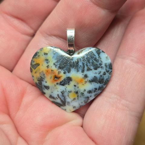 This heart reads pale and quiet at first glance. The opal itself is semi translucent white, but the embedded metallic marcasite throws a cool blue cast across the surface, shifting with the light. Dark iron sprays cut through the softness like frozen movement.