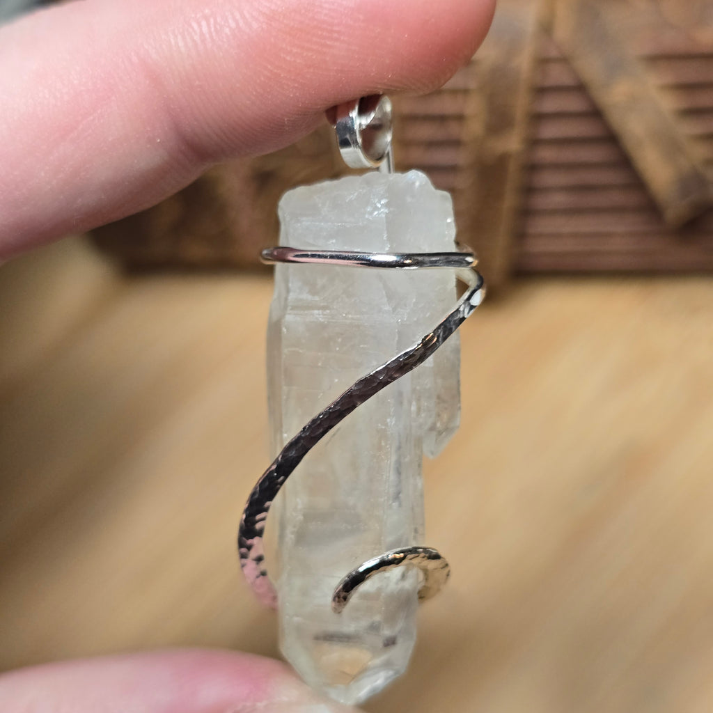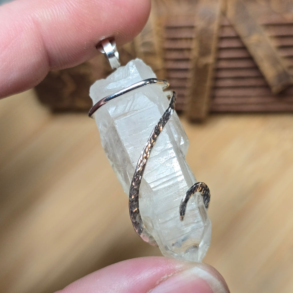This pendant feels like it was grown by the mountain itself — raw quartz crystal wrapped in hand-forged sterling, clear as glacier melt and full of quiet strength. Each natural step along the crystal’s prism faces formed as silica-rich water cooled deep within the earth, layer by layer, until light itself seemed to take shape.
