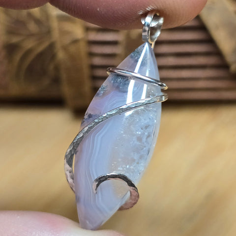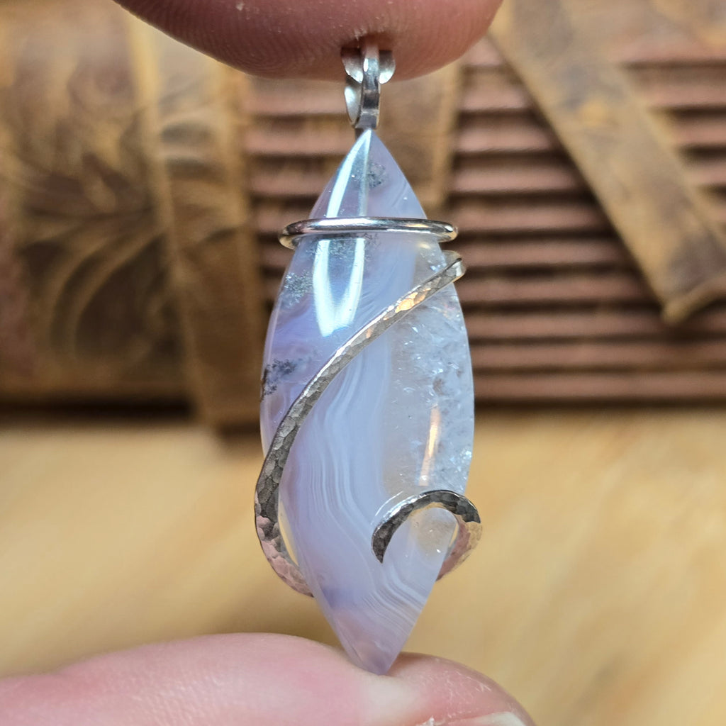 This pendant looks like twilight caught in stone — a lilac sky streaked with silver clouds. Fine purple banding flows through clear chalcedony, interrupted by metallic moss-like inclusions that glimmer like rain on granite. It’s both delicate and elemental, a fusion of softness and strength that feels alive in shifting light.