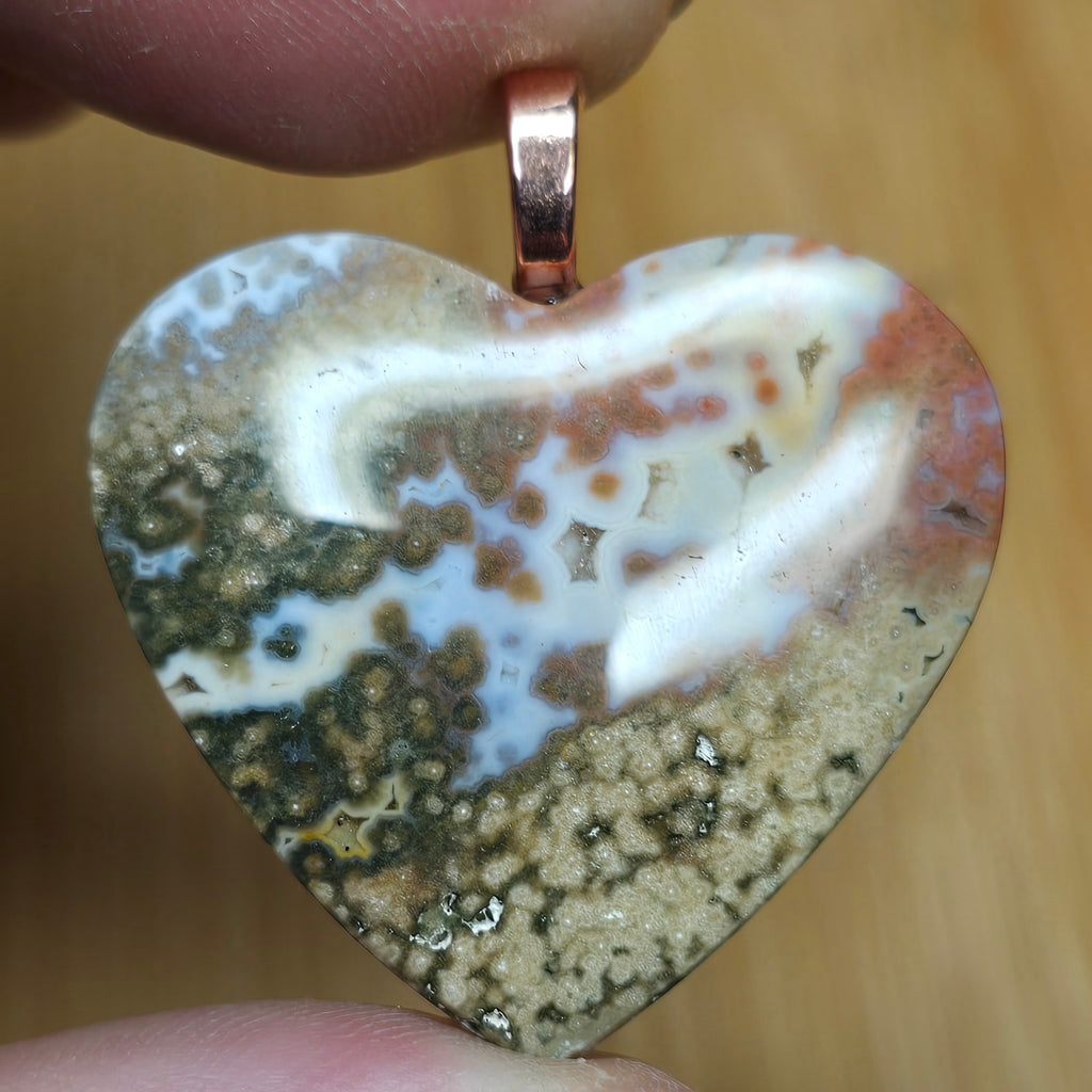 This heart-shaped river jasper carries the calm rhythm of water meeting stone. Warm sand tones flow into olive green and soft cream, with touches of russet that resemble late light over a riverbank. Each pattern is a frozen current — mineral sediments settling into layers and orbs within ancient volcanic rock, now transformed by time and silica into this dense, durable jasper.